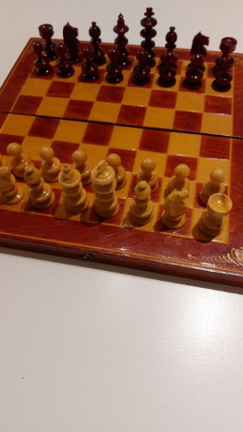 Ein klappbares Holzschach ohne Koordinaten abzugeben. In der Innenseite befindet sich ein Backgammon Feld. Damesteine und Würfel mit dabei. Günstig abzugeben.